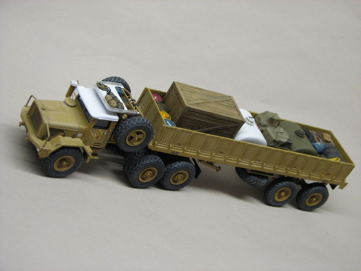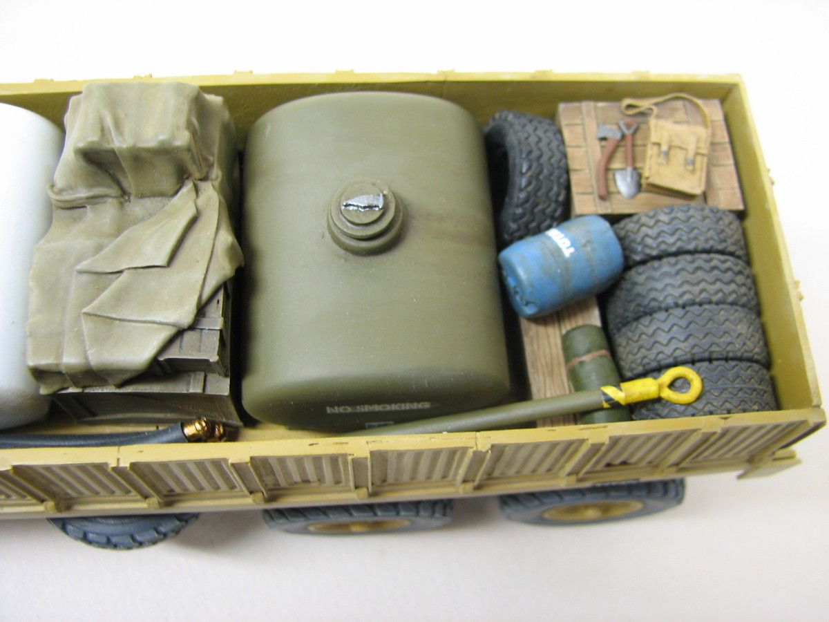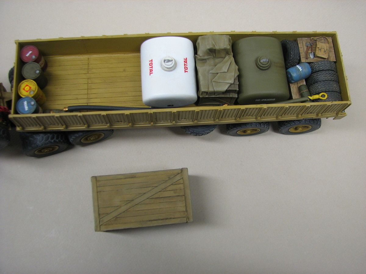 J'avoue avoir eu un plaisir fou à créer petit à petit ce chargement avec des pneus, bidons, caisses ,fûts, barre de remorquage, tuyaux souples et autres citernes... qui forment un ensemble "harmonieux " qui je l'espère vous plaira autant qu'à moi.
