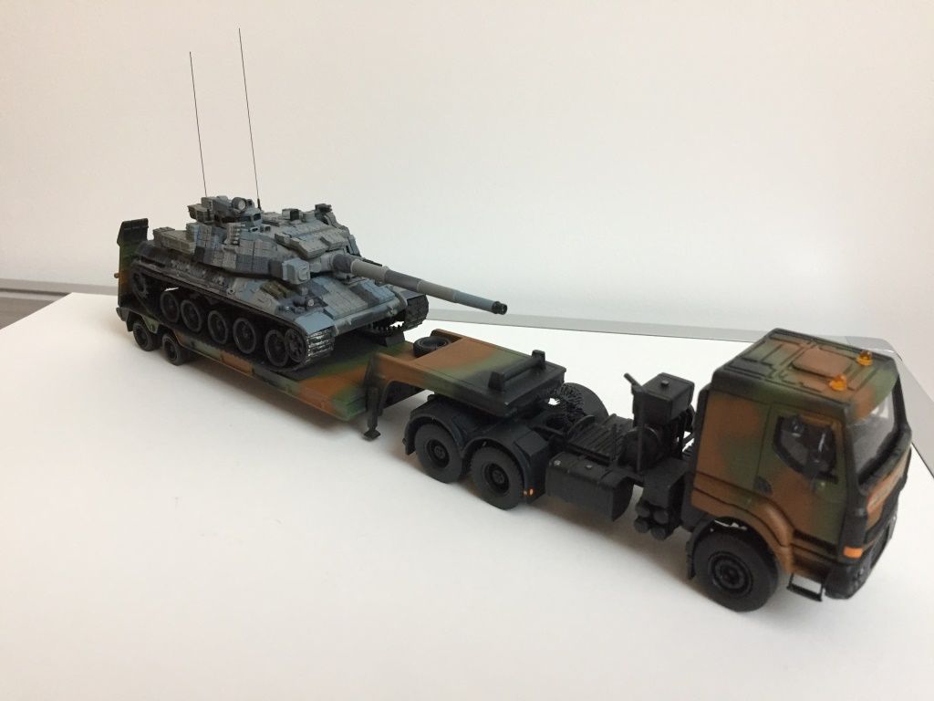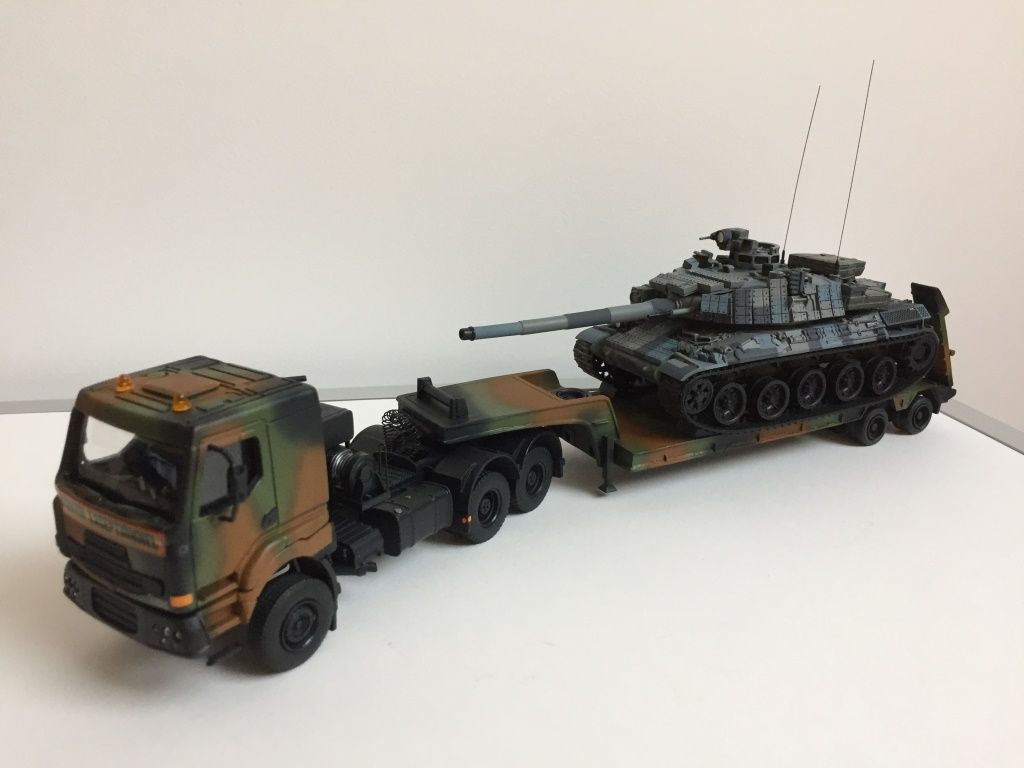 Le porte char est un SISU E-tech au 1/50 de chez minicamiondetp (https://minicamionsdetp.skyrock.mobi/) avec un double treuil acheté sur eBay (en white métal).